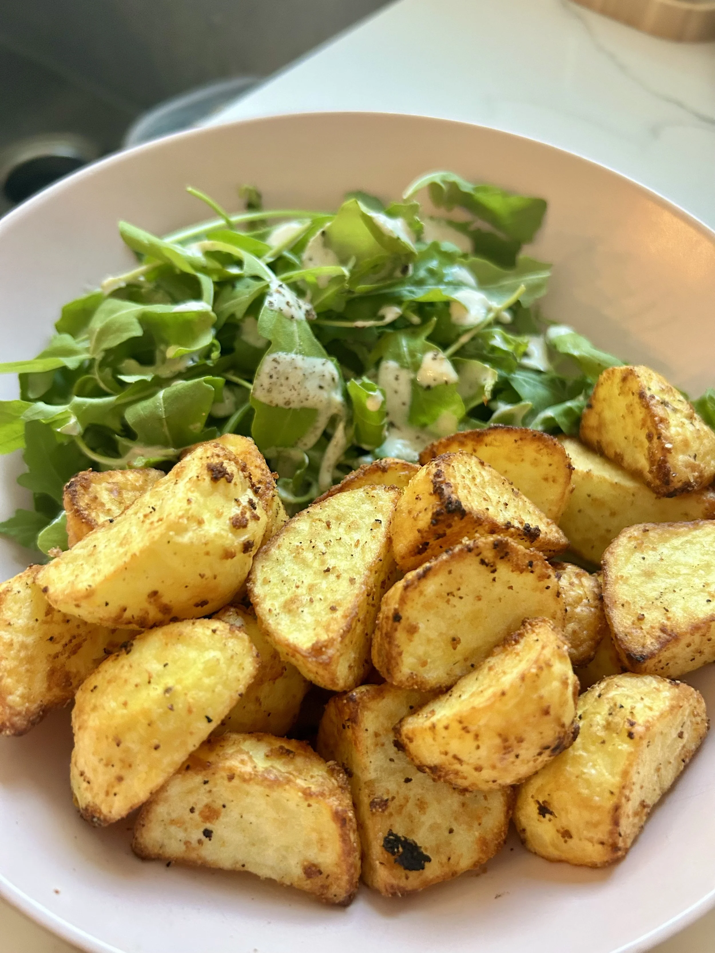 This is one of my quickest, coziest bowls. Crispy air-fried potatoes over fresh arugula with a creamy garlic tahini sauce, all made with simple, healing ingredients. It’s satisfying, grounding and so easy to throw together on busy days.